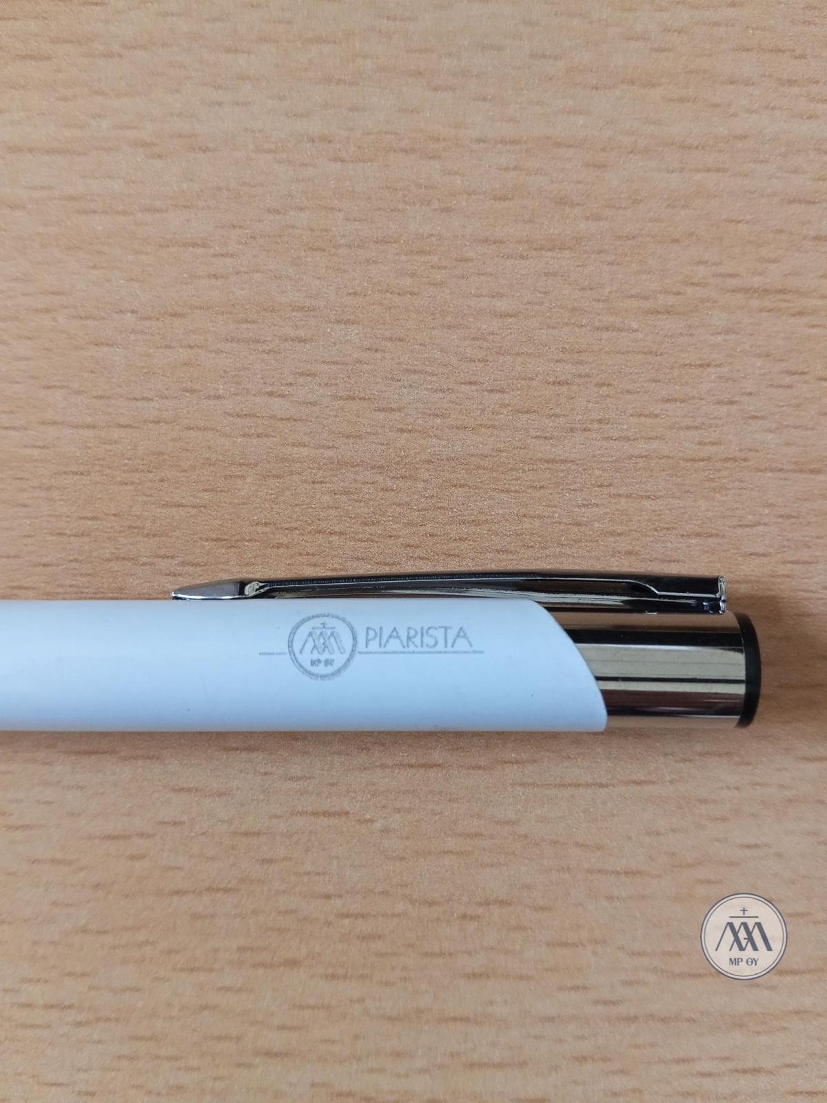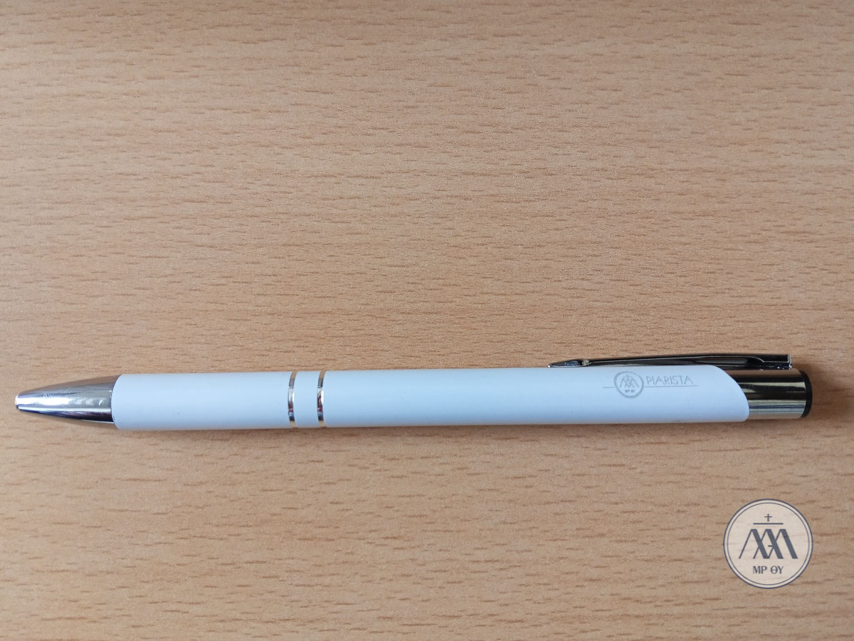 Nyomógombos golyóstoll, kék színű tollbetéttel, piarista felirattal és logóval.